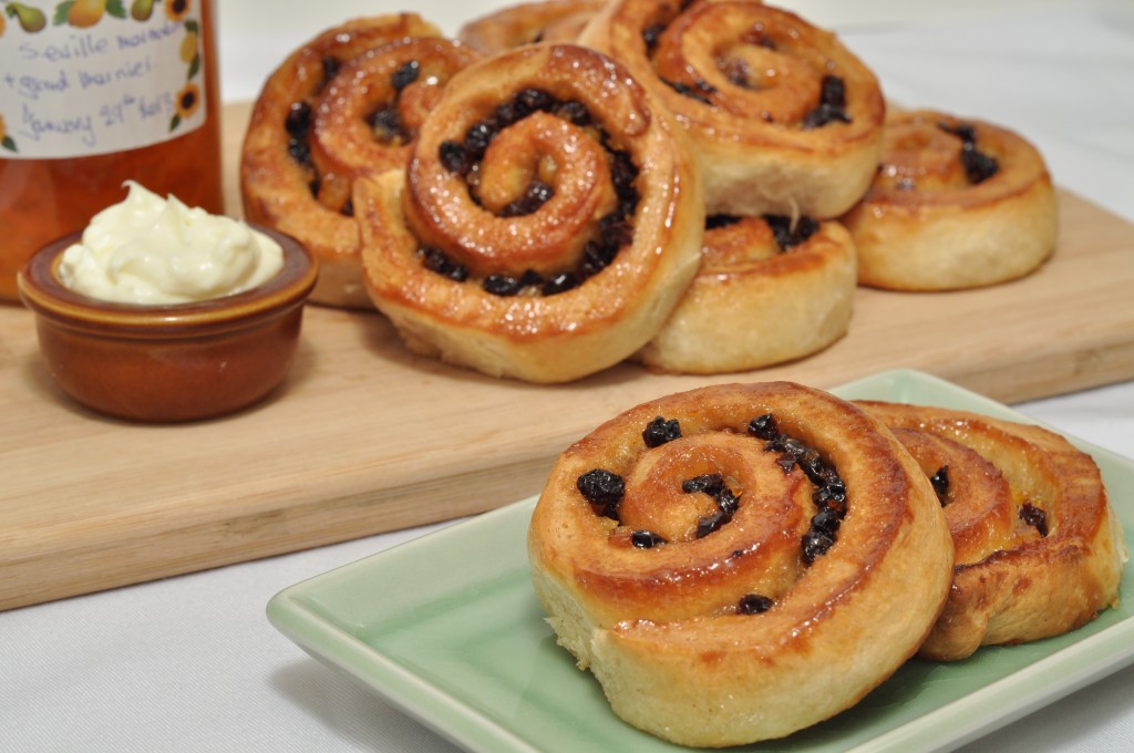 Ingredients: For the dough: 2 cups all-purpose flour ½ teaspoon cinnamon ½ teaspoon kosher salt 4 oz. unsalted butter, at room temperature, cut into small dice ½ cup whole milk, heated to lukewarm 1 teaspoon active-dry yeast 1 tablespoon golden syrup* For the filling: 2 tablespoons unsalted butter, melted ¼ cup brown sugar ⅓ cup orange marmalade ½ cup dried currants To glaze: 3 tablespoons honey * This British sweetener is usually sold under the brand name Lyle’s Golden Syrup, and can be found in either the baking or syrup sections of grocery stores. If you can’t find it, just use an equal measure of granulated sugar.Technique: